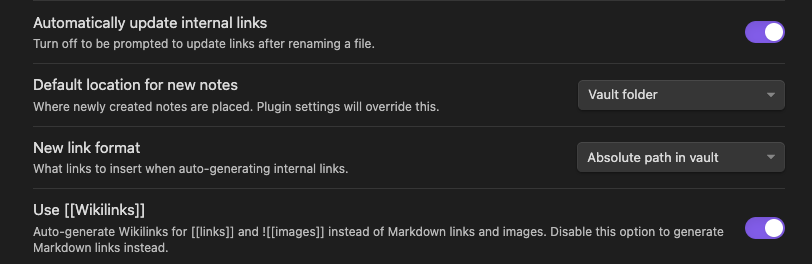 - Set the New link format to Absolute Path in vault. If you have a completely flat vault (no folders), this step isn’t necessary.